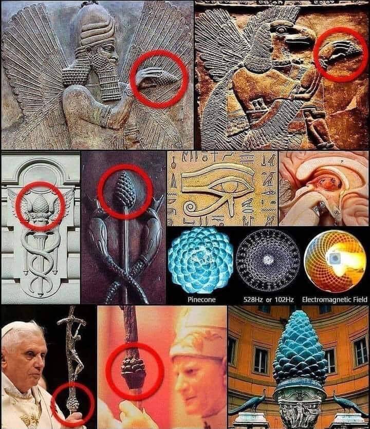 Dans les vieux temples des Sumérians et des Babyloniens, il y avait un culte de la glande pinéale et même au Vatican on peut voir une statue sous forme d'ananas ou de glande ananas, qui est également portée par les papes, et il y a des hiéroglyphes sur les murs des pyramides.
